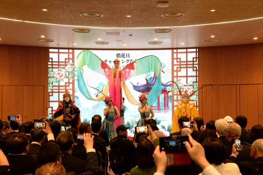 28日、開幕式で演劇「川劇」や人形劇など四川省の無形文化遺産を披露する役者。(大阪=新華社記者/涂一帆)