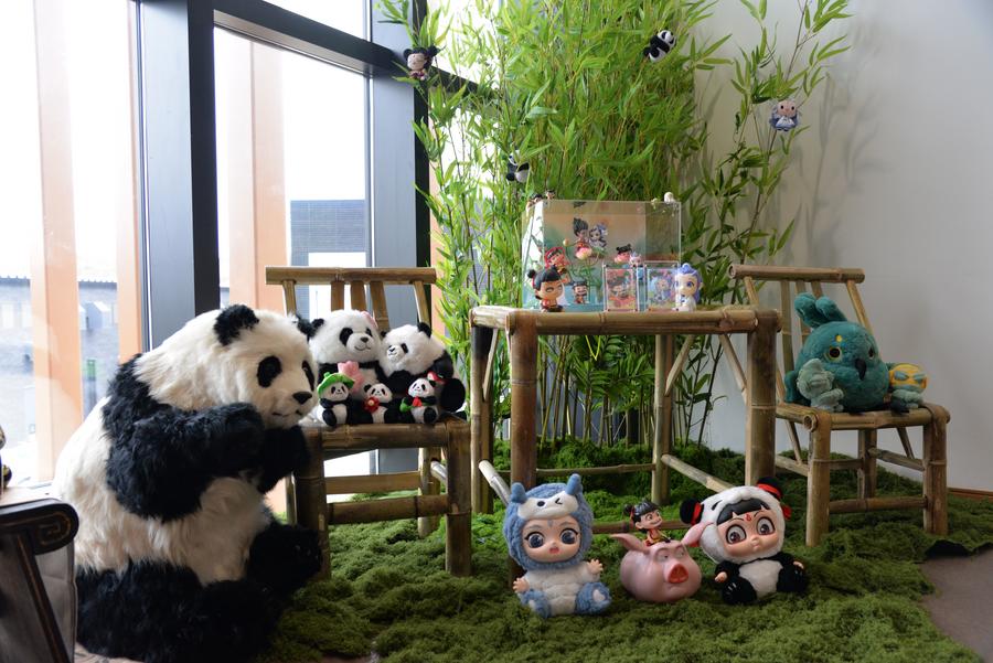 28日、中国パビリオンに展示されたパンダなどをモチーフにしたグッズ。(大阪=新華社記者/涂一帆)