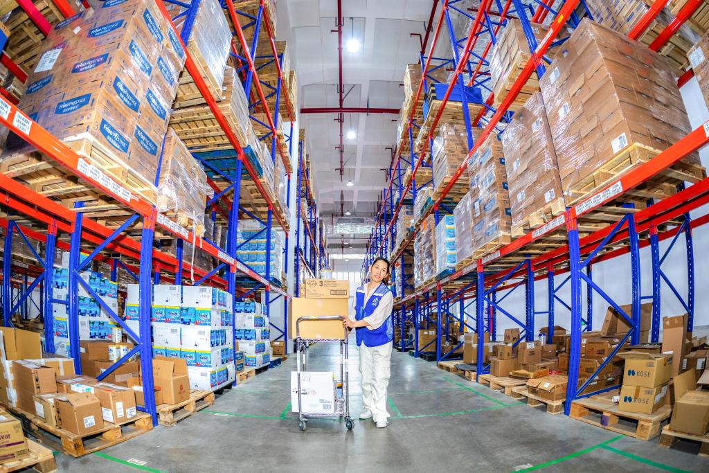 浙江省温州総合保税区にある京東集団(JDドットコム)の倉庫で宅配便の配送作業を行う従業員。(温州=新華社配信/劉吉利)