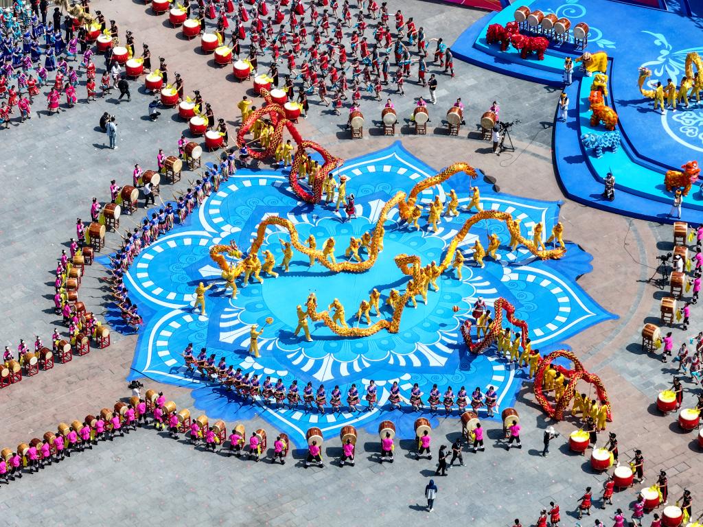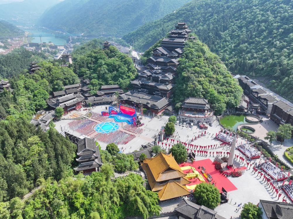28日、重慶市彭水ミャオ族トゥチャ族自治県の蚩尤九黎城で伝統行事に参加するミャオ族の人々。(ドローンから、重慶=新華社記者/唐奕)