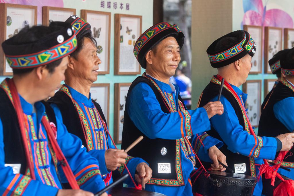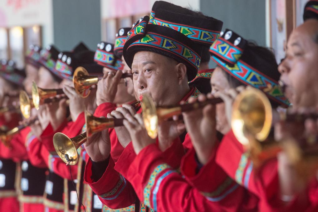 28日、伝統行事「踩花山祭り」で伝統楽器を演奏するミャオ族の人々。(重慶=新華社記者/唐奕)