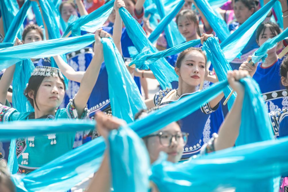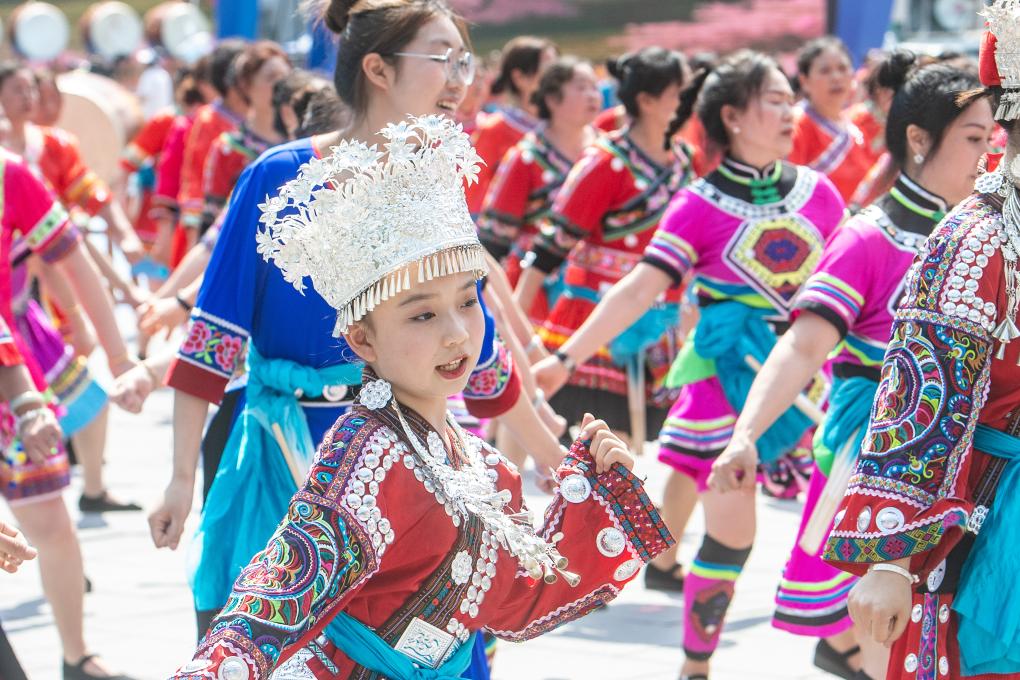 踩花山祭りは最も盛大に行われるミャオ族の伝統行事で、「歌の集い」「踊りの集い」「民俗の集い」「出会いの集い」を通じて自然への畏敬と賛美を表現し、若者が幸福を祈り、共に喜びを分かち合う深い文化的意味合いを伝える。(記者/唐奕)