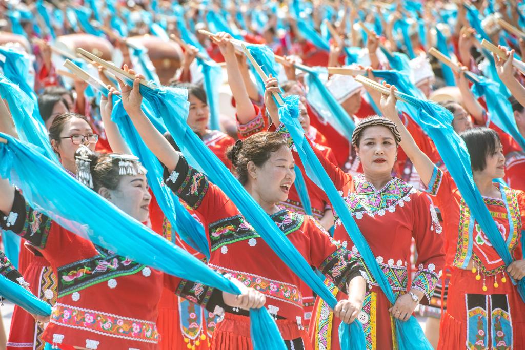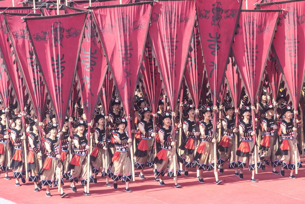 28日、重慶市彭水ミャオ族トゥチャ族自治県の蚩尤九黎城で伝統行事に参加するミャオ族の人々。(重慶=新華社記者/唐奕)