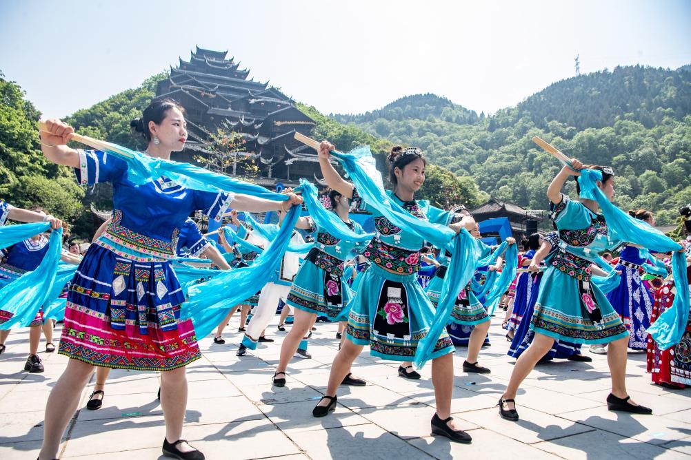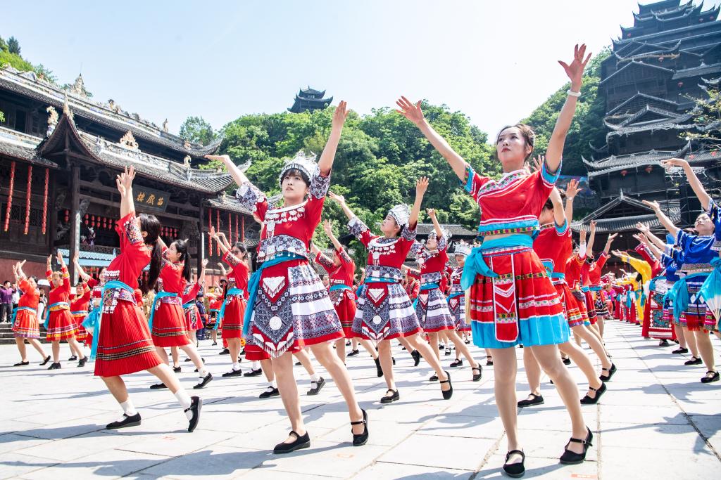 【新華社重慶4月30日】中国重慶市彭水ミャオ族トゥチャ族自治県の観光スポット蚩尤九黎城(しゆうきゅうれいじょう)で28日、第14回中国烏江ミャオ族踩花山祭りが開催された。各地から訪れた観光客と美しく着飾ったミャオ族の若者が伝統の祭りを共に楽しんだ。