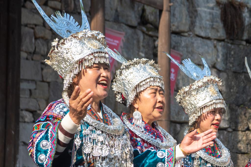 28日、伝統行事「踩花山祭り」で歌い踊るミャオ族の人々。(重慶=新華社記者/唐奕)