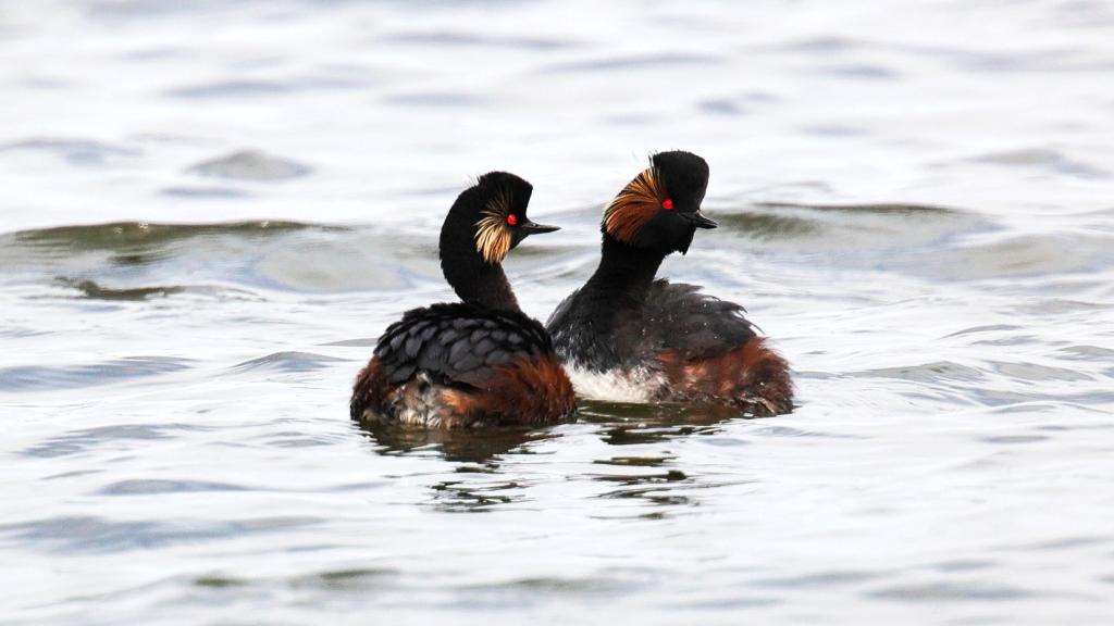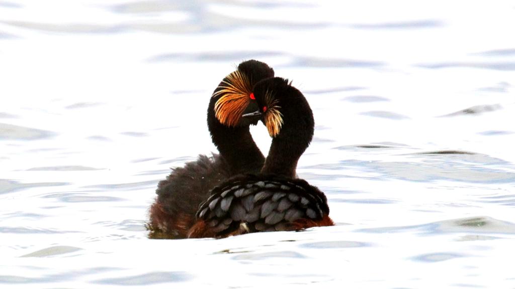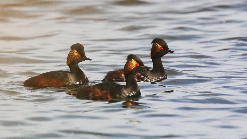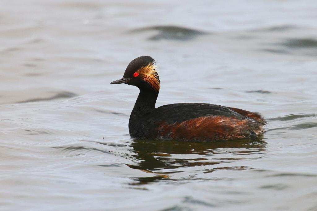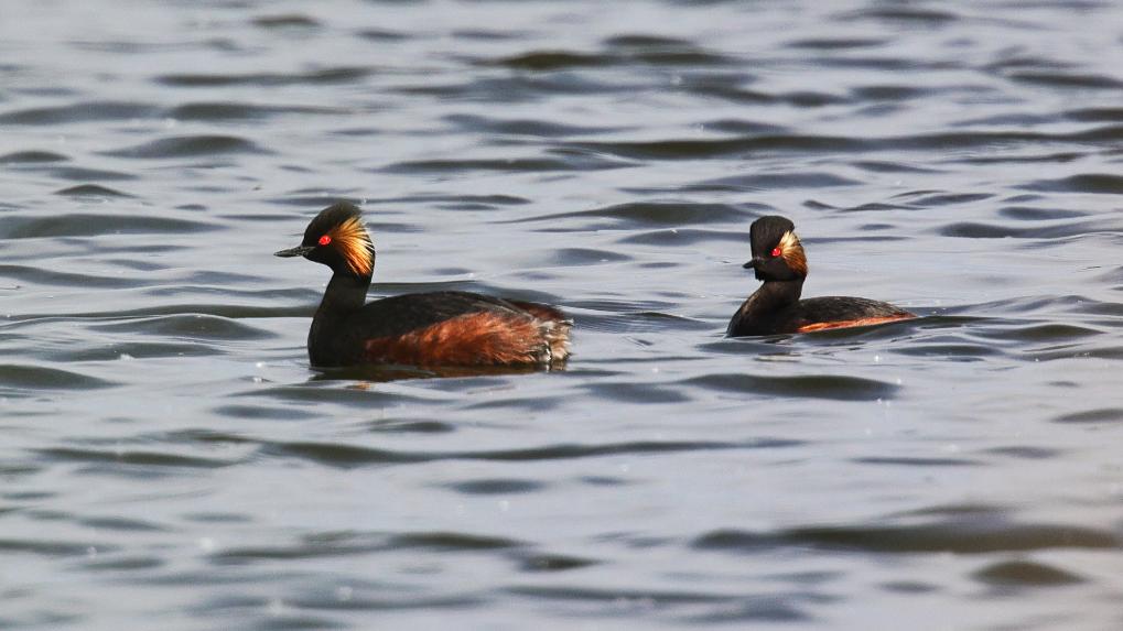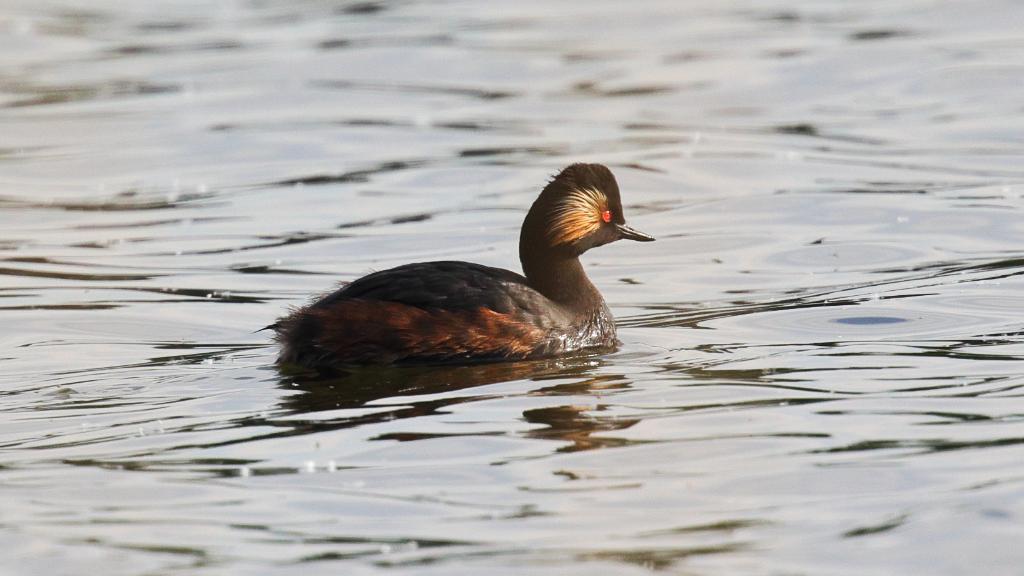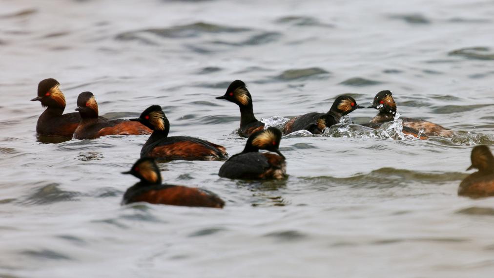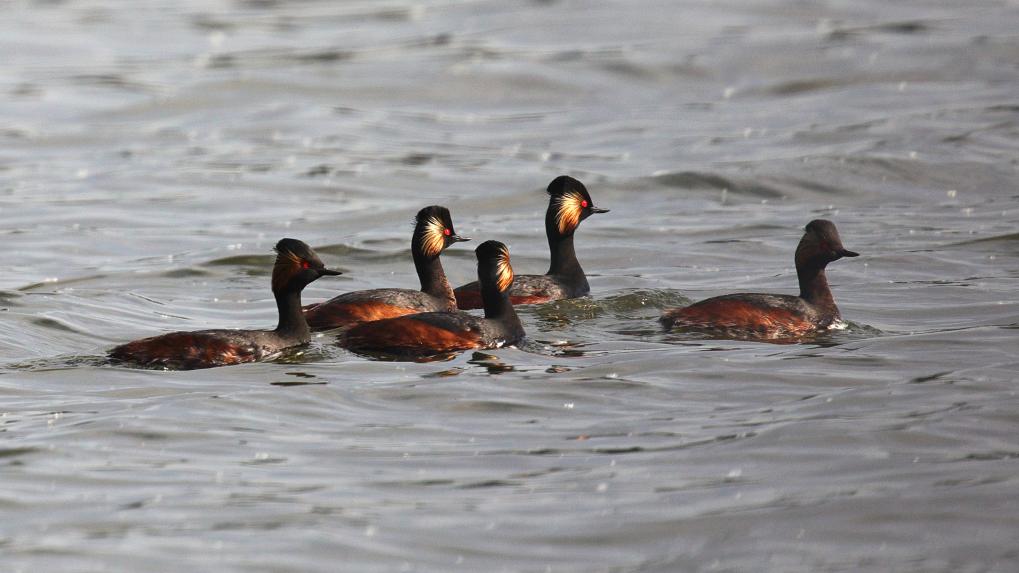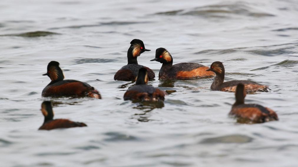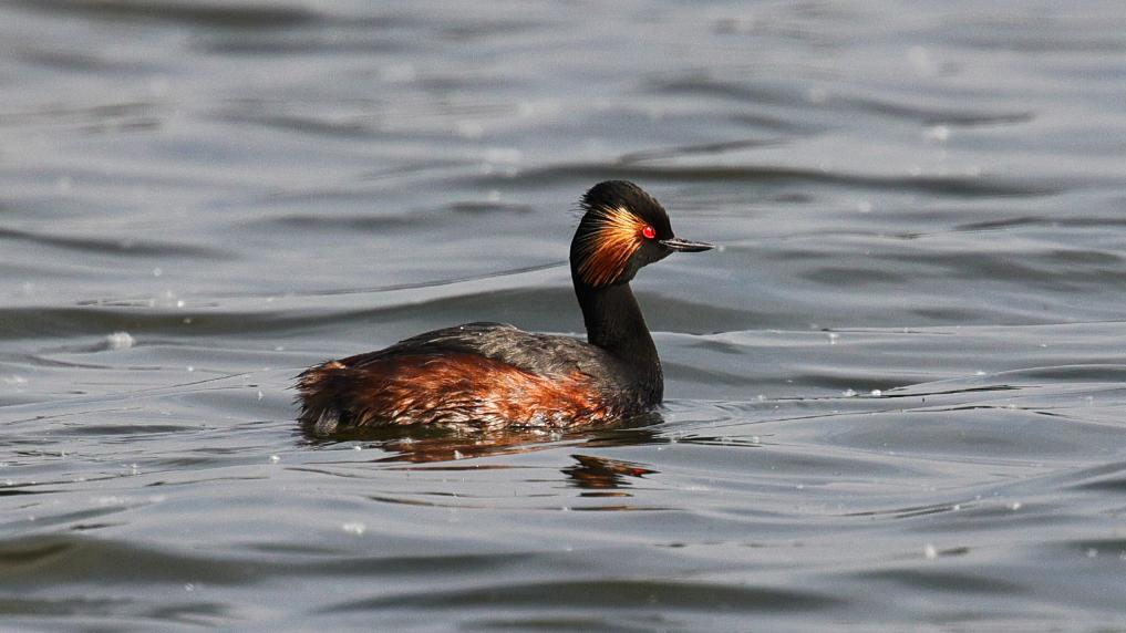 1日、北京市昌平区の沙河ダムで泳ぐハジロカイツブリ。(北京=新華社配信/郭連友)