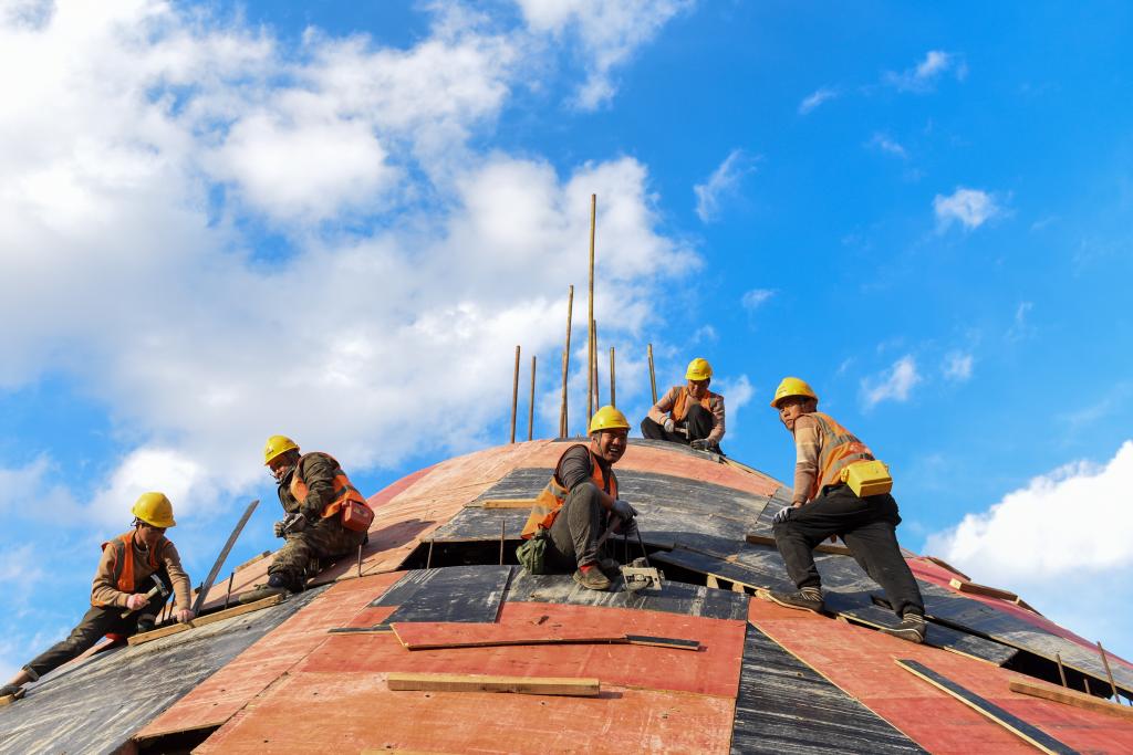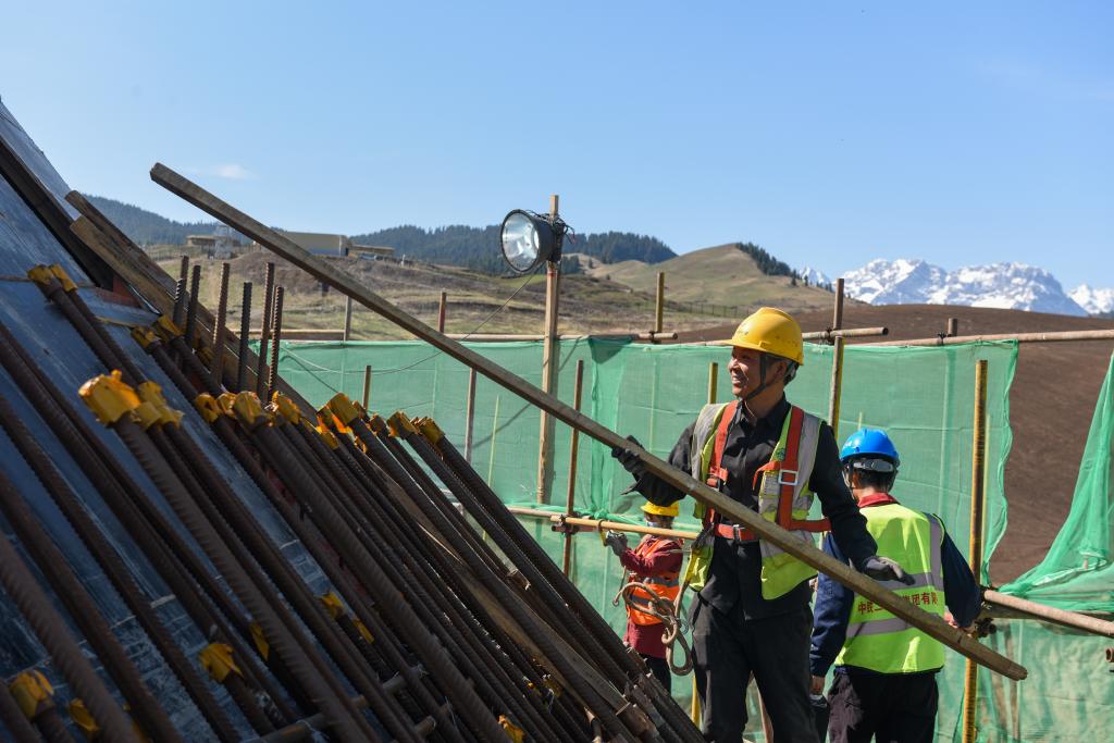 4月29日、奇台電波望遠鏡の中央タワーで施工する作業員。(ウルムチ=新華社記者/高晗)