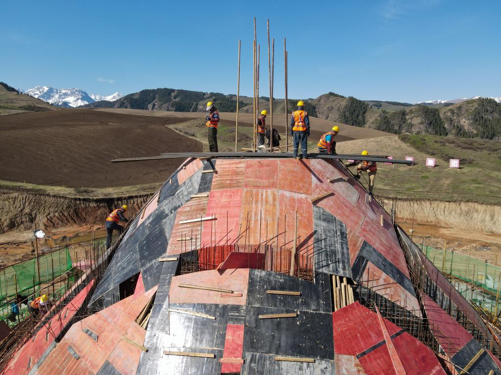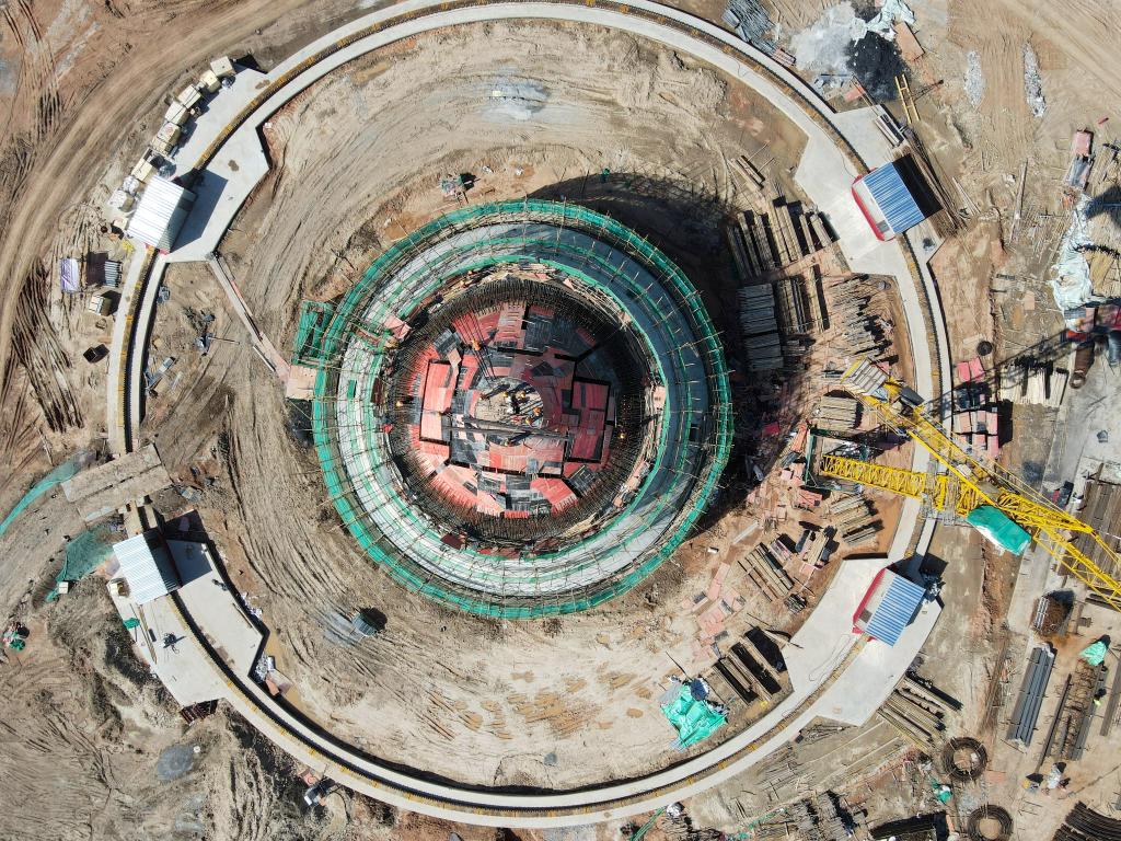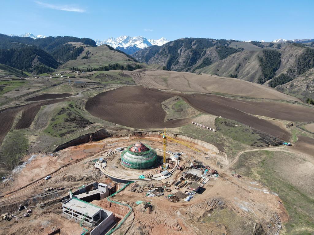 4月30日、建設が進む奇台電波望遠鏡の中央タワーと付帯施設。(ドローンから、ウルムチ=新華社記者/高晗)