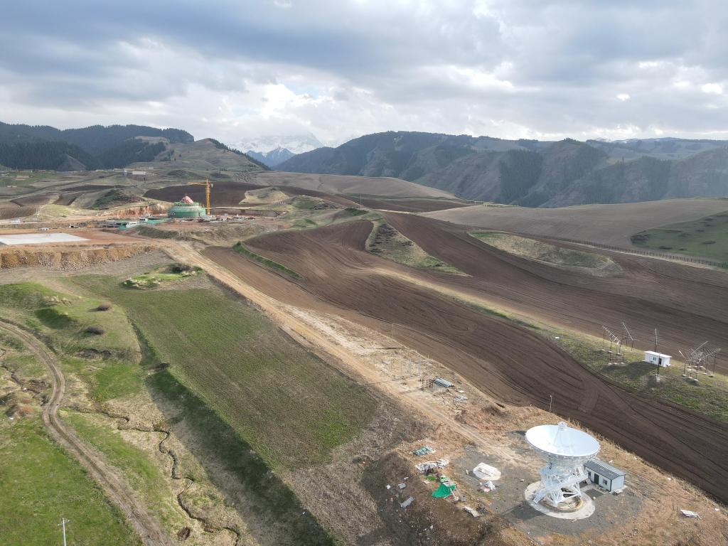 4月30日、奇台電波望遠鏡の施工現場。(ドローンから、ウルムチ=新華社記者/高晗)