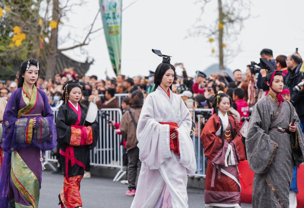 漢王朝の衣装をまとい、閬中古城をパレードする人々。(3月29日撮影、閬中=新華社記者/江宏景)