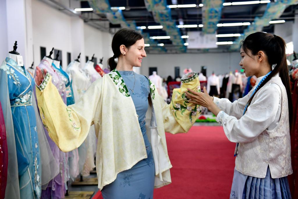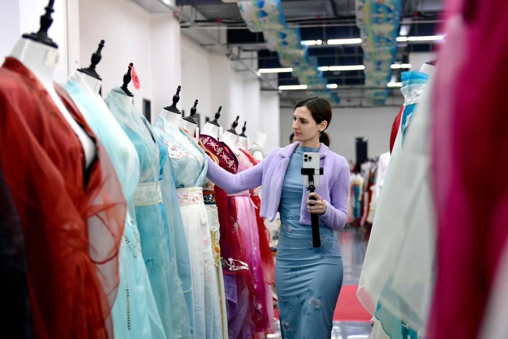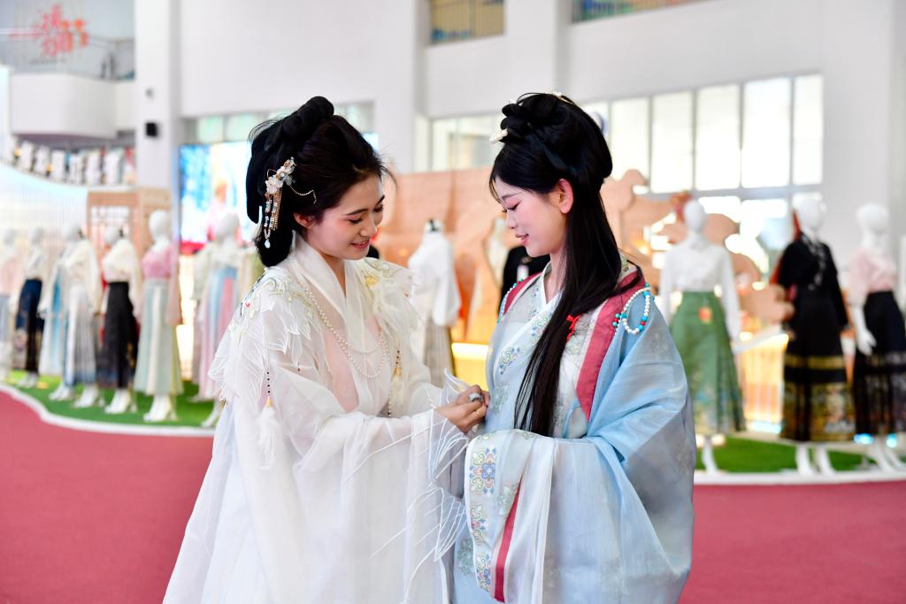山東省渮沢市曹県にある漢服のネット通販を手がける有愛雲倉漢服基地で漢服を試着するロシア人(左)。(4月8日撮影、菏沢=新華社記者/郭緒雷)