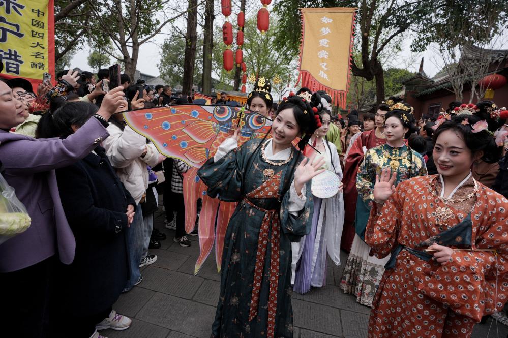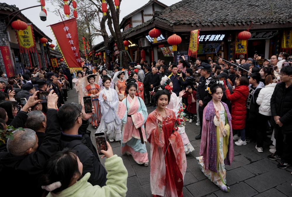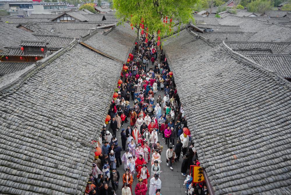 パレード参加者と見物客でにぎわう閬中古城。(3月29日撮影、閬中=新華社記者/江宏景)