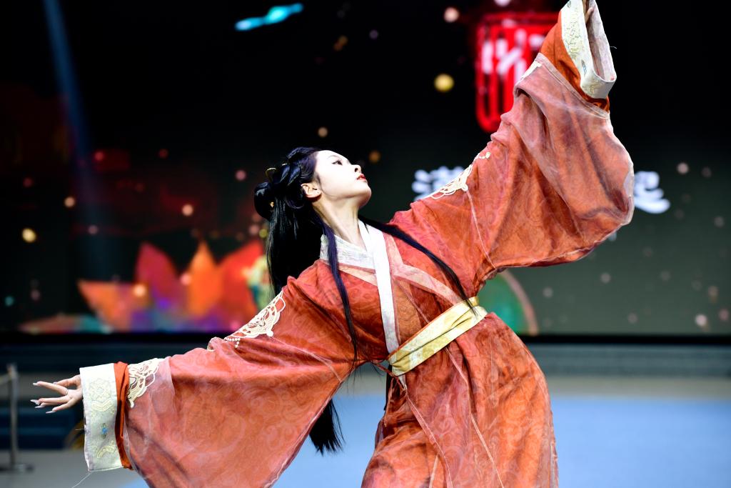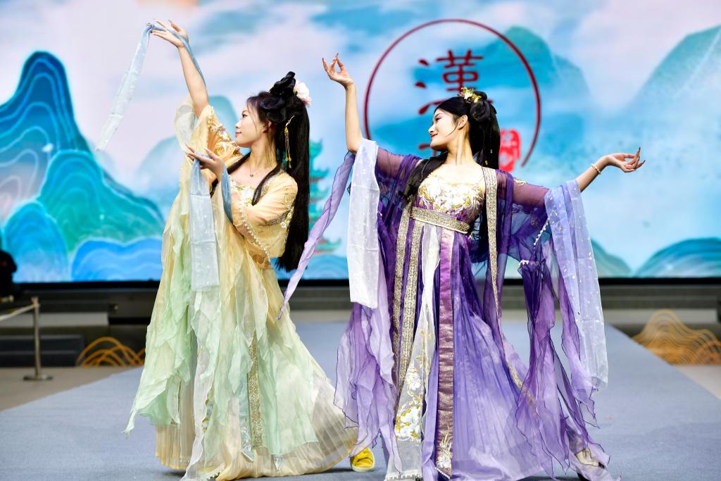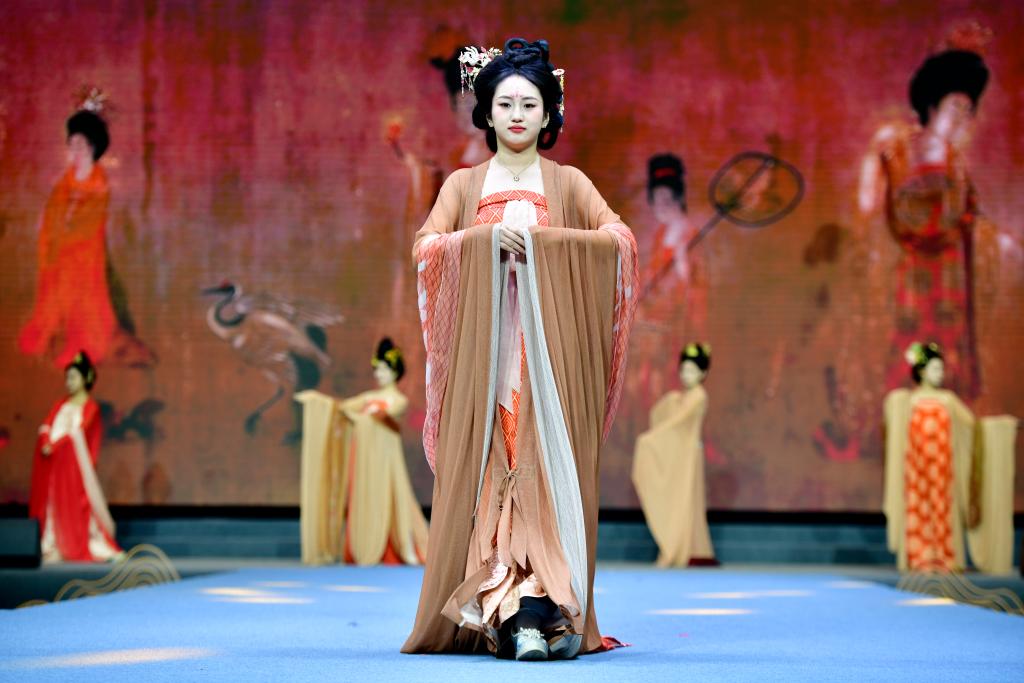 山東省渮沢市曹県のe裳小鎮デジタル経済産業パークで行われた2025春夏新製品発表会で衣装を披露するモデル。(4月10日撮影、菏沢=新華社記者/郭緒雷)
