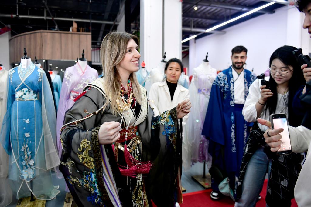 山東省渮沢市曹県にある漢服のネット通販を手がける有愛雲倉漢服基地で漢服を試着するイタリア人。(4月8日撮影、菏沢=新華社記者/郭緒雷)