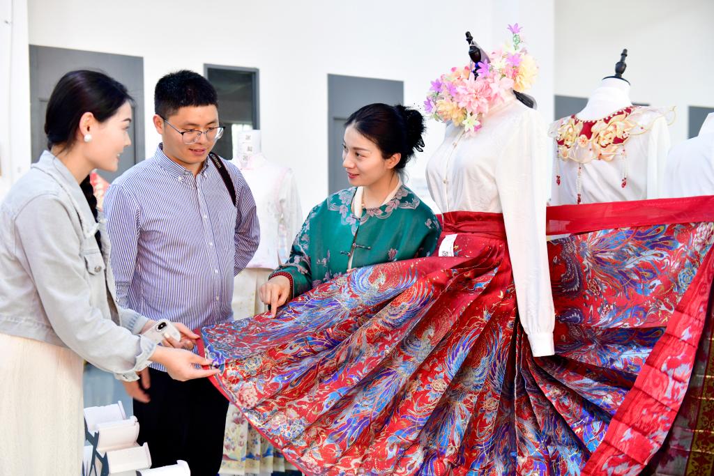 山東省渮沢市曹県にある漢服のネット通販を手がける有愛雲倉漢服基地で中国の伝統的なひだ付きスカート「馬面裙」を見学者に紹介する従業員(右)。(4月10日撮影、菏沢=新華社記者/郭緒雷)
