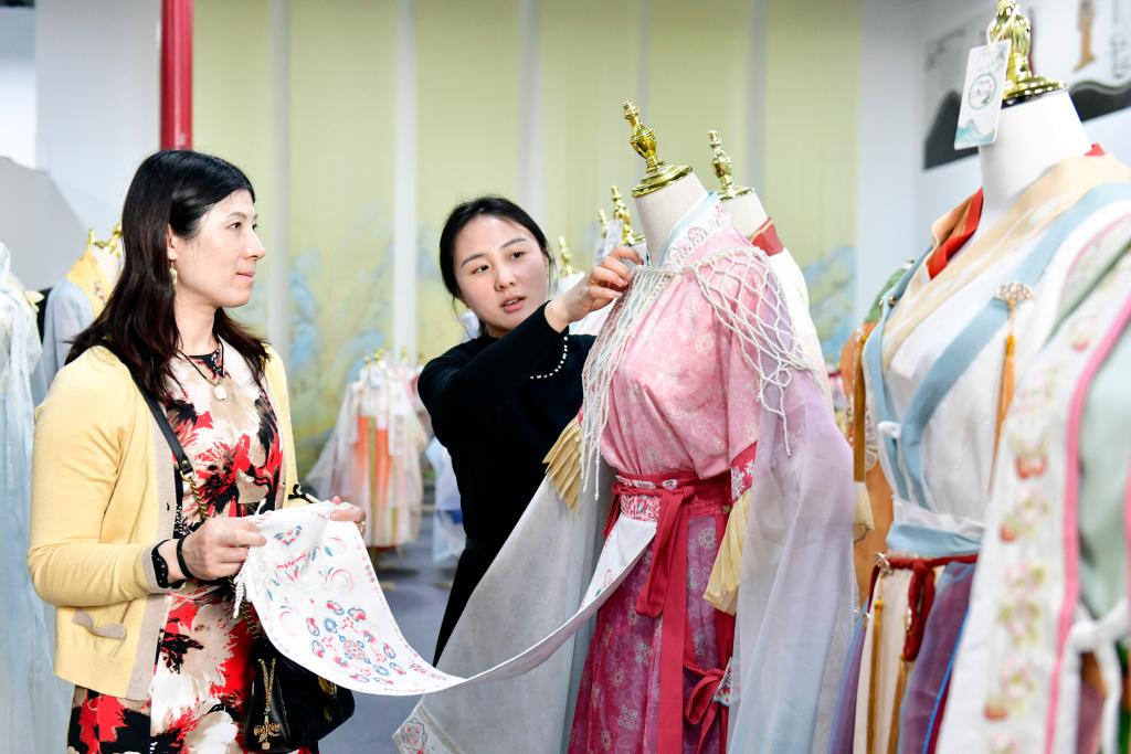 山東省渮沢市曹県の漢服産業拠点で顧客に漢服を紹介する従業員(右)。(4月10日撮影、菏沢=新華社記者/郭緒雷)