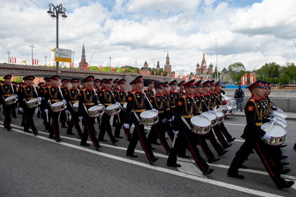 7日、閲兵式のリハーサルに臨む兵士ら。(モスクワ=新華社配信)