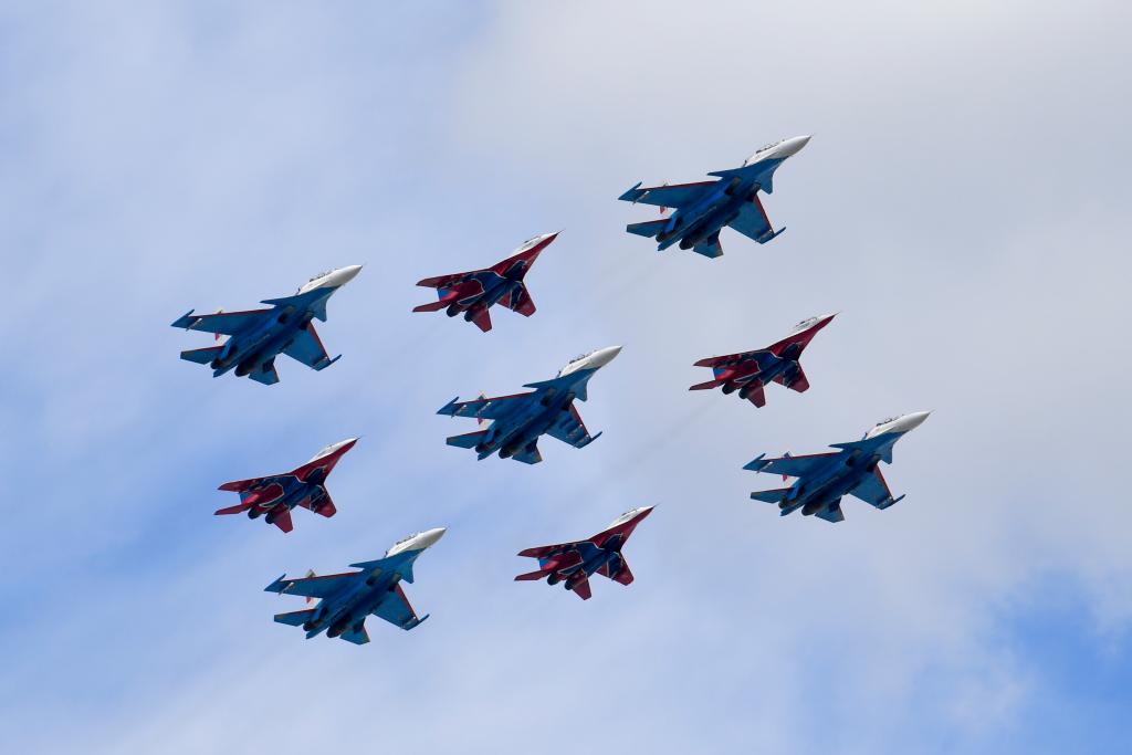 7日、閲兵式のリハーサルに参加した戦闘機の編隊。(モスクワ=新華社配信)
