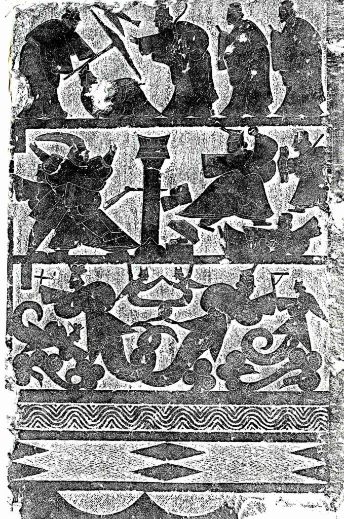 武氏墓群石刻の漢画像石「荊軻刺秦王」。(曲阜=新華社配信)