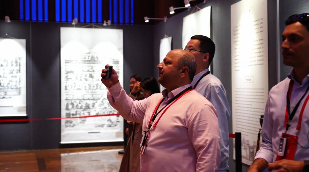 石上史詩・対話千年-武氏祠漢画石刻拓片展で展示を見る人たち。(曲阜=新華社配信)
