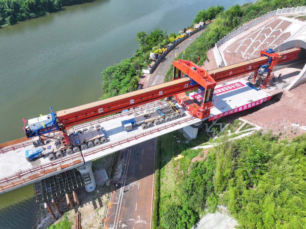 7日、成渝中線高速鉄道・玄天湖複線大橋の建設現場で、最後の箱桁を架設する架梁機。(ドローンから、重慶=新華社記者/唐奕)