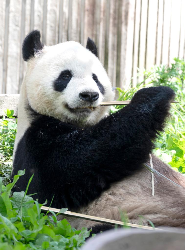 【新華社成都5月13日】中国四川省にある中国ジャイアントパンダ保護研究センター雅安碧峰峡基地で12日、パンダのリーリー(力力、雄、中国名「比力」)が竹を食べる様子が見られた。リーリーは2023年に上野動物園から返還された子どものシャンシャン(香香)に続き、翌24年に中国に戻った。