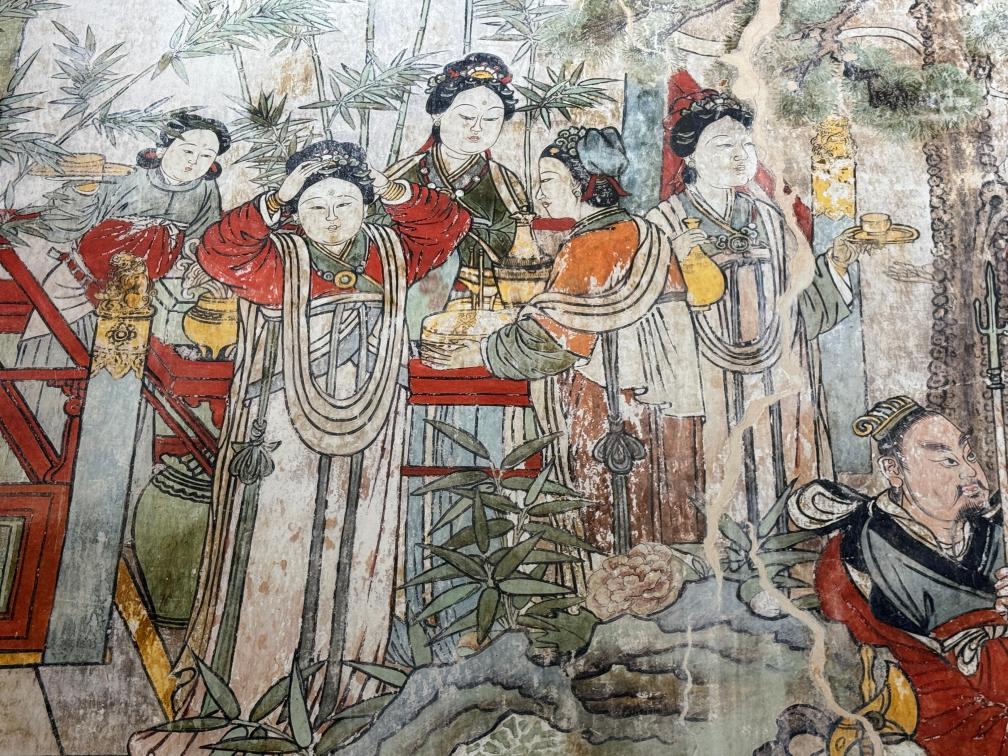 3日、広勝寺の元代壁画「庭院梳粧(そしょう)図」。(太原=新華社記者/王学濤)