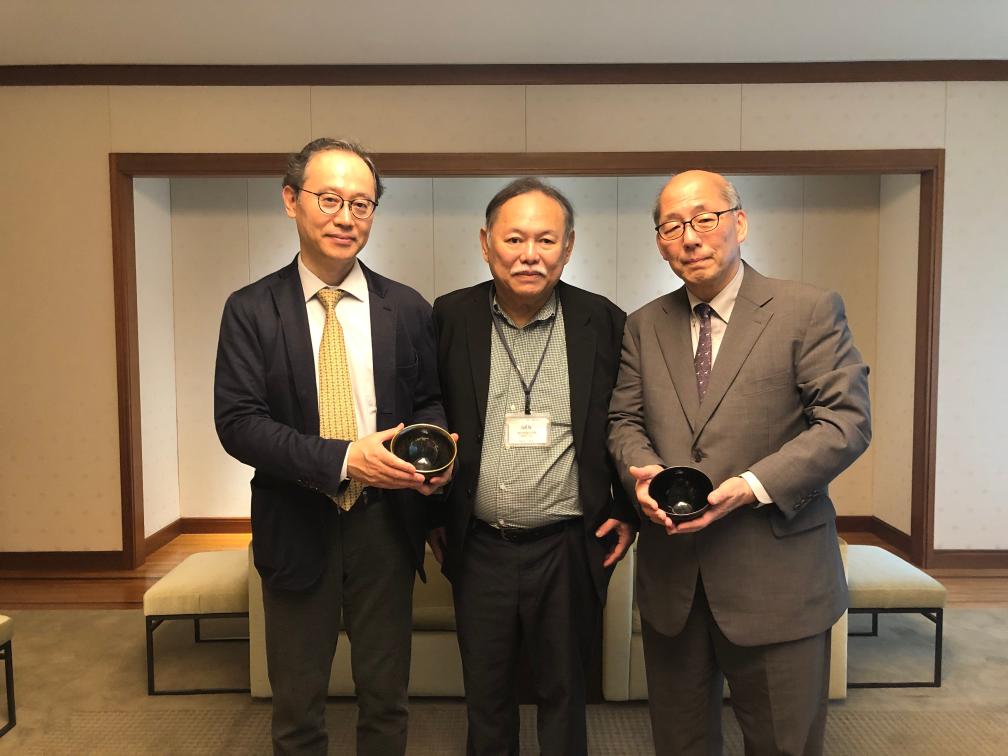 17日、大阪市立東洋陶磁美術館の守屋雅史館長(右)と小林仁学芸課長代理(左)と記念撮影する、今回の寄贈を企画した陶磁器収集家の厳崇建氏(中央)。(大阪=新華社配信)