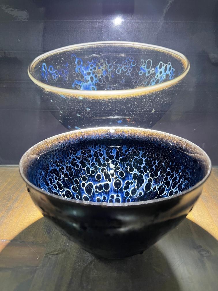劉子竜氏が制作した曜変天目茶わん(前)と藤田美術館が所蔵する宋代の曜変天目茶わんの写真(後ろ)。(資料写真、大阪=新華社配信)