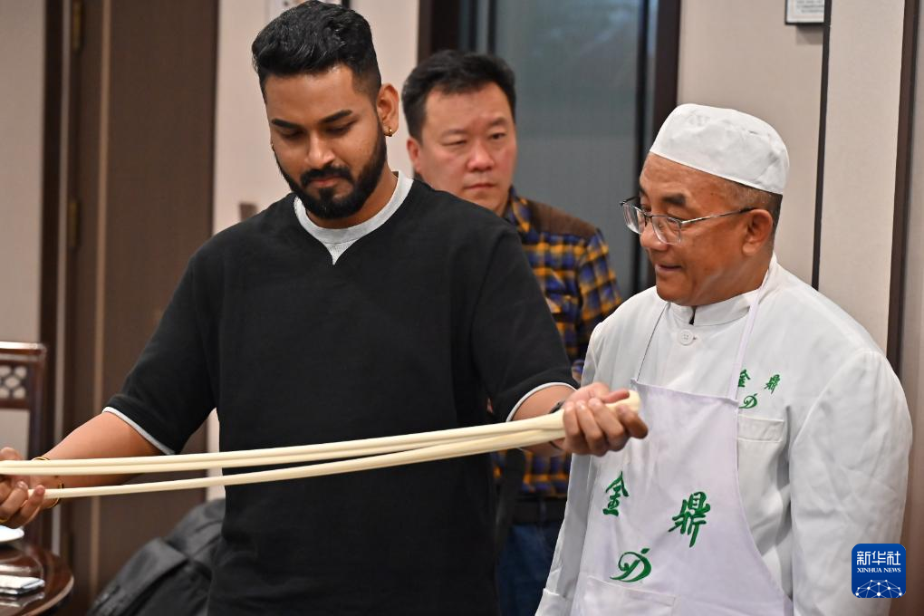 ラーメン作りを体験する外国人観光客。(4月7日撮影、蘭州=新華社配信)
