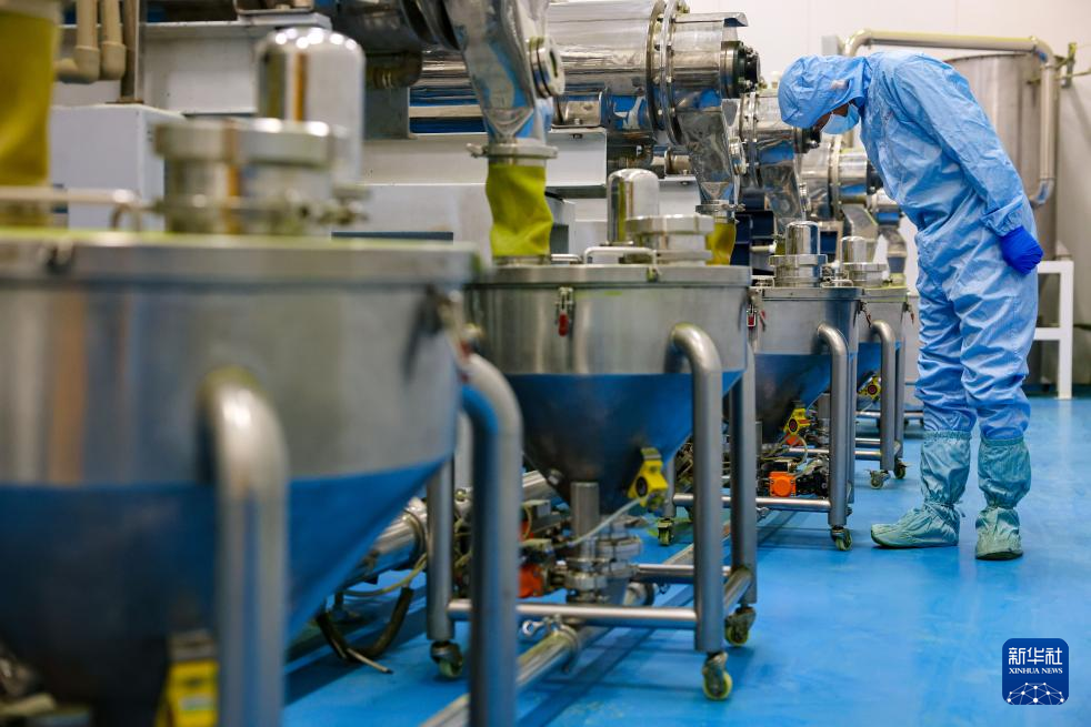 貴茶集団が江口県に建設した生産拠点「貴茶産業パーク」の抹茶生産ラインで作業する従業員。(4月14日撮影、貴陽=新華社記者/欧東衢)