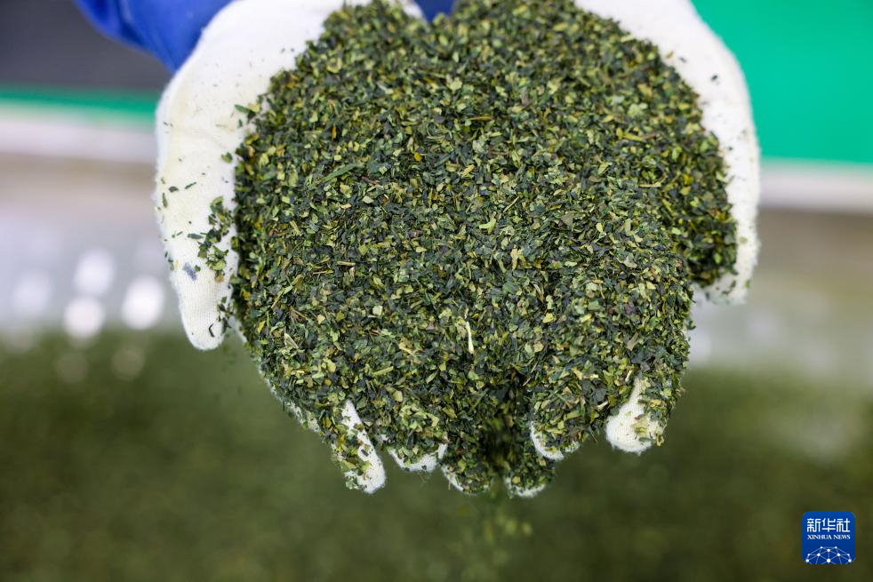 貴茶集団が江口県に建設した生産拠点「貴茶産業パーク」の抹茶生産ラインで原料を検査する従業員。(4月14日撮影、貴陽=新華社記者/欧東衢)
