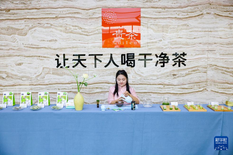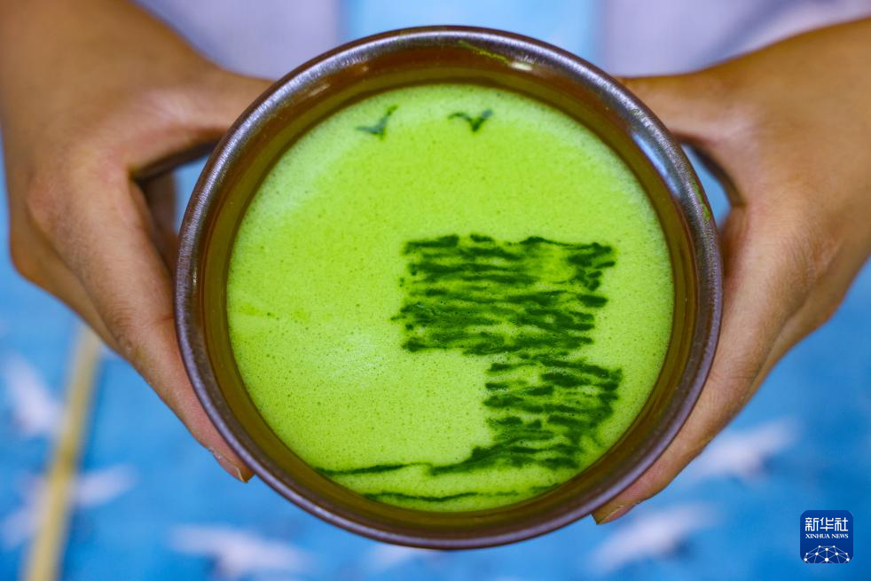 貴茶集団が江口県に設けた生産拠点「貴茶産業パーク」で抹茶ドリンクを見せる従業員。(4月14日撮影、貴陽=新華社記者/欧東衢)