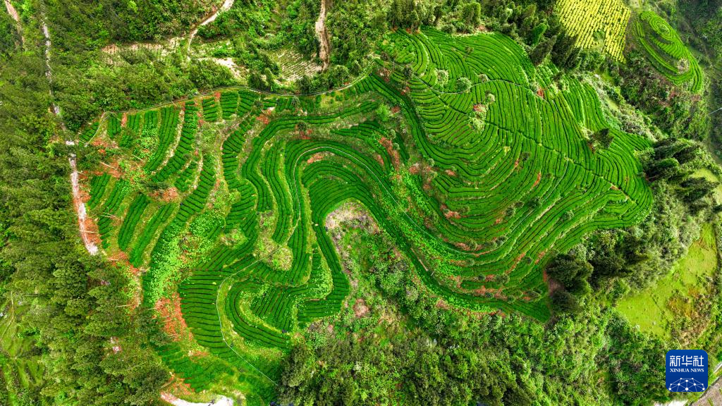 貴州省銅仁市江口県の九竜山茶園。(4月16日、ドローンから、貴陽=新華社記者/欧東衢)