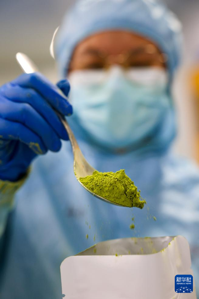 貴茶集団が江口県に建設した生産拠点「貴茶産業パーク」の抹茶生産ラインで抹茶パウダーを小分け包装する従業員。(4月14日撮影、貴陽=新華社記者/欧東衢)