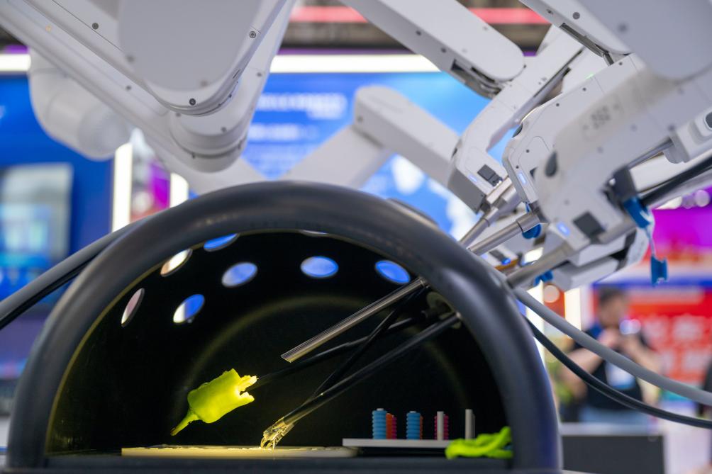 19日、ハルビン国際経済貿易商談会のメイン会場で、医療用ロボットを操作して模擬手術を行う来場者。(ハルビン=新華社記者/謝剣飛)