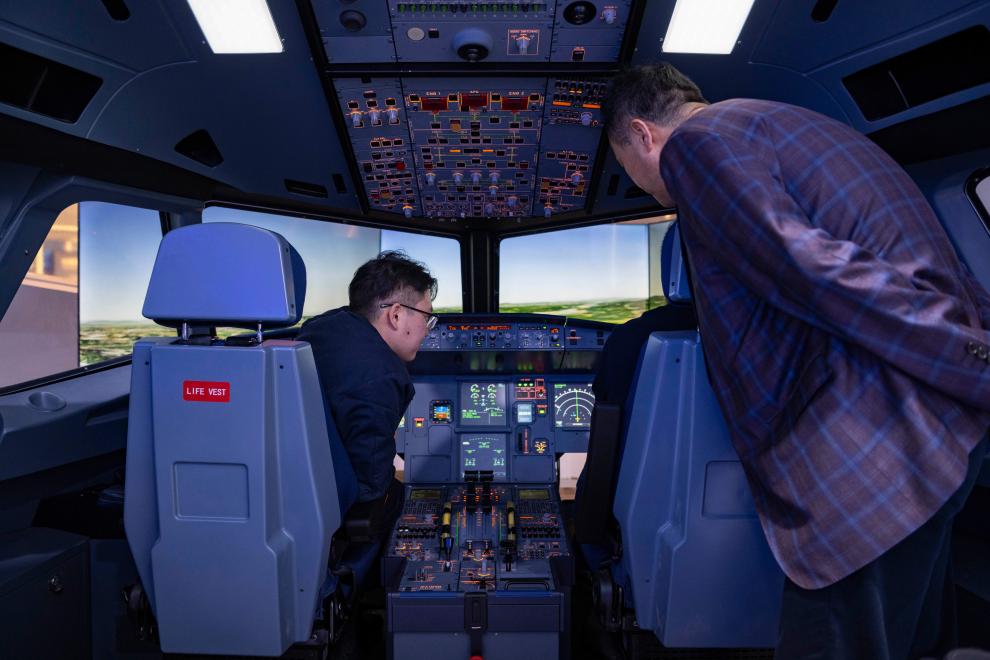 19日、ハルビン国際経済貿易商談会のメイン会場で、フライトシミュレーターで飛行機の操縦体験をする来場者。(ハルビン=新華社記者/謝剣飛)