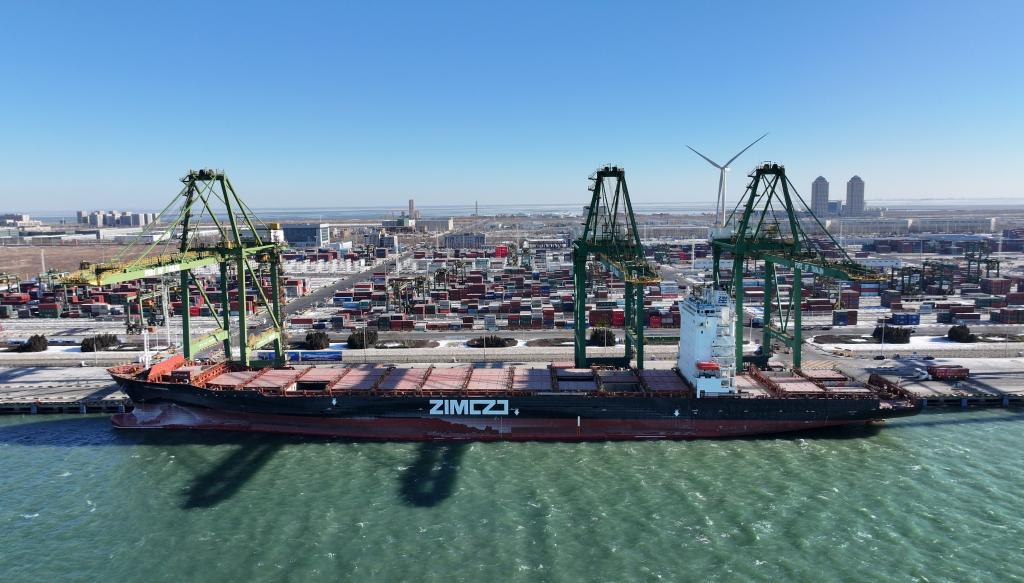 天津港に接岸するコンテナ船「ルアンダ号」。(2023年12月21日、ドローンから、津=新華社記者/趙子碩)