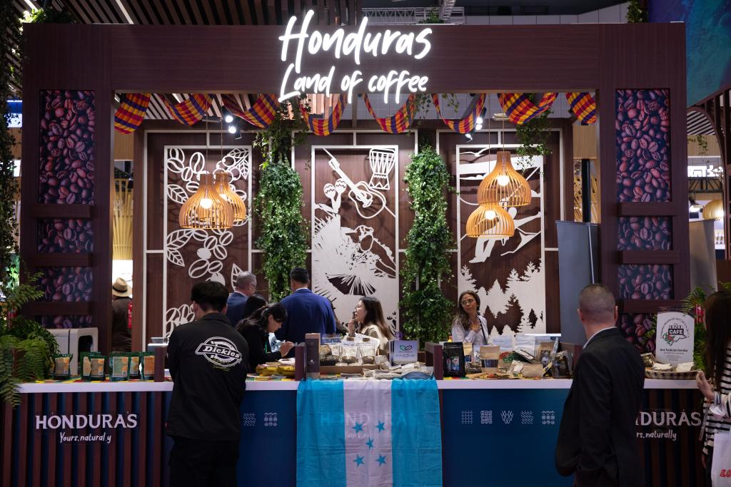 第6回中国国際輸入博覧会のホンジュラスのパビリオンでコーヒー豆などの製品について尋ねる来場者。(2023年11月6日撮影、上海=新華社記者/金立旺)