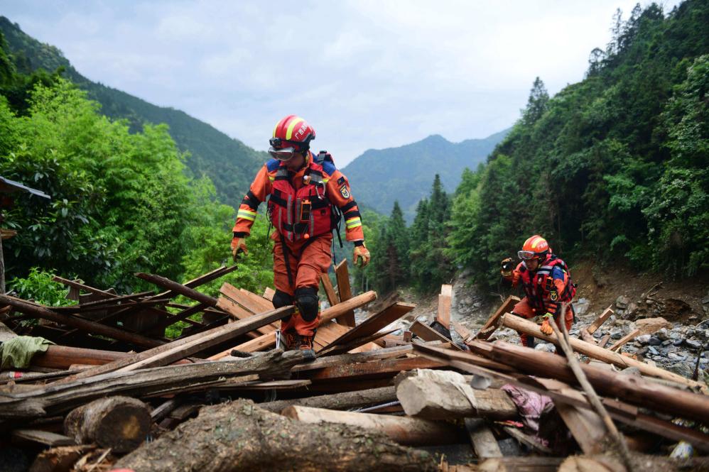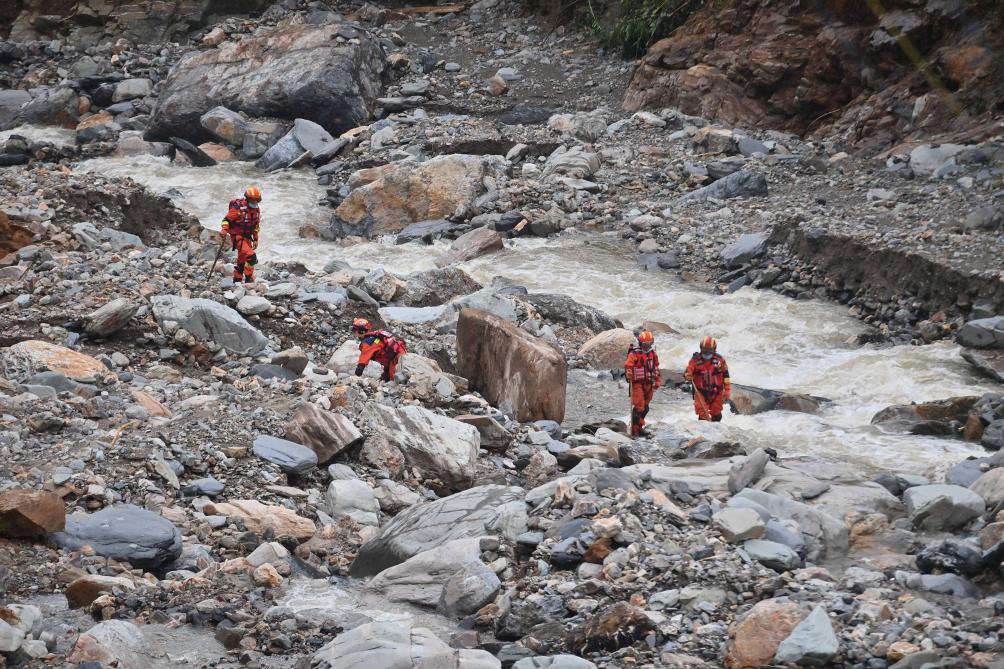 23日、土石流現場で捜索活動をする救援隊員。(竜勝=新華社配信/潘志祥)