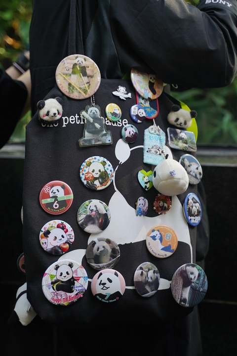 12日、日本のファンが提げていた、シャンシャンのバッジで飾られたバッグ。(成都=新華社配信)