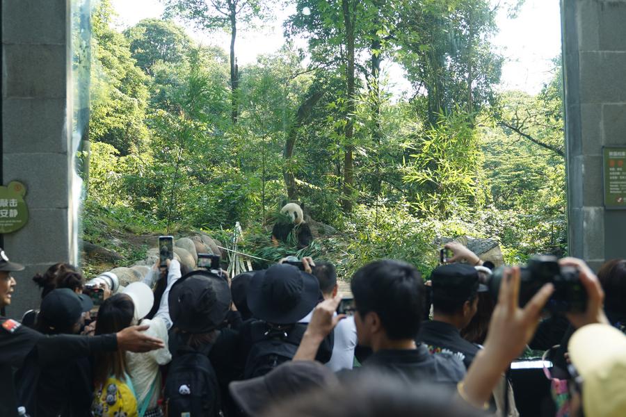 12日、シャンシャンを見つめる日本のパンダファンら。(成都=新華社配信)