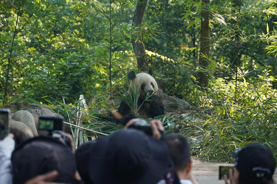 【新華社成都6月13日】中国四川省にある中国ジャイアントパンダ保護研究センター雅安碧峰峡基地で12日、日本生まれのパンダ、シャンシャン(香香)が8歳の誕生日を迎えた。日本からも多くのファンがお祝いに駆けつけた。シャンシャンは2017年6月12日、上野動物園で父親リーリー(力力、中国・比力)と母親シンシン(真真、中国名・仙女)の間に生まれた雌で、23年2月に中国に返還された。