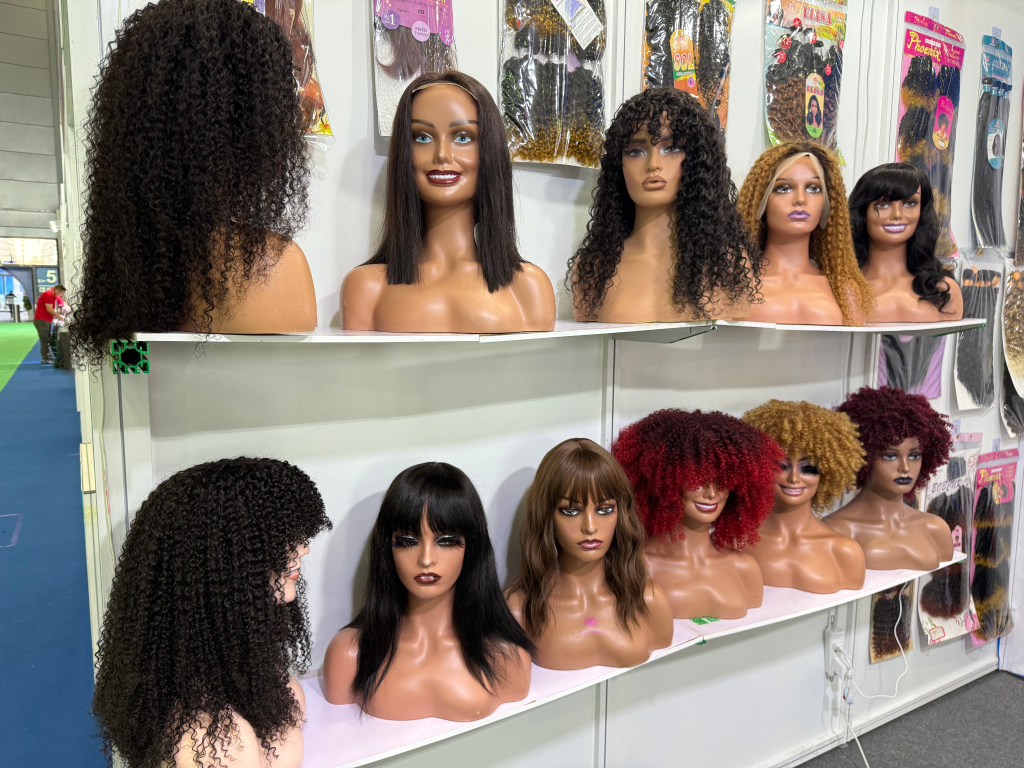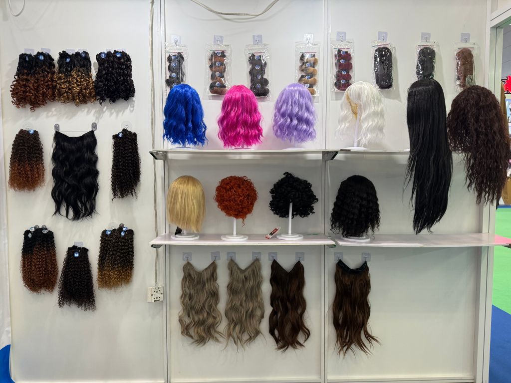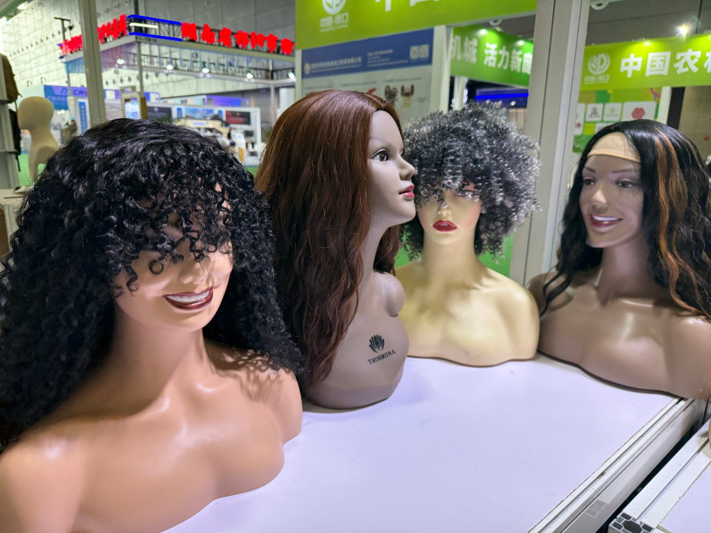 14日、第4回中国・アフリカ経済貿易博覧会の邵陽市元泰実業ブースに並んだウィッグ。(長沙=新華社記者/常博深)