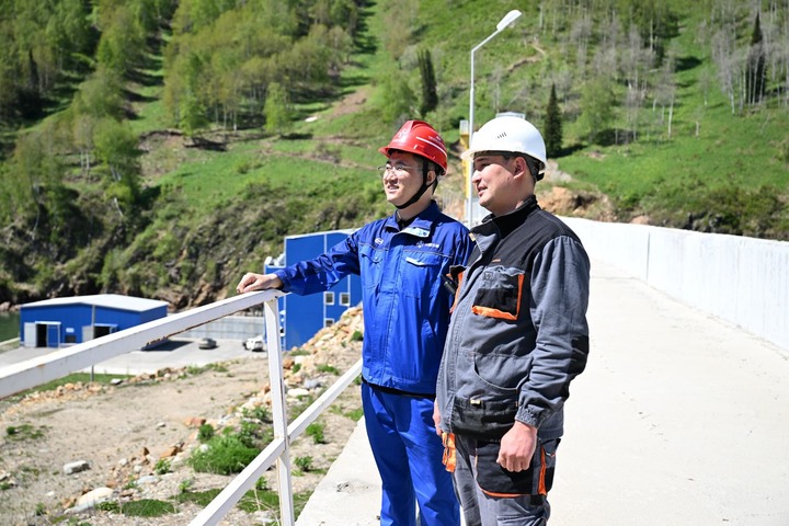 カザフスタン東カザフスタン州にあるトゥルグスン水力発電所で話し合う従業員。(5月8日撮影、アスタナ=新華社記者/李任滋)