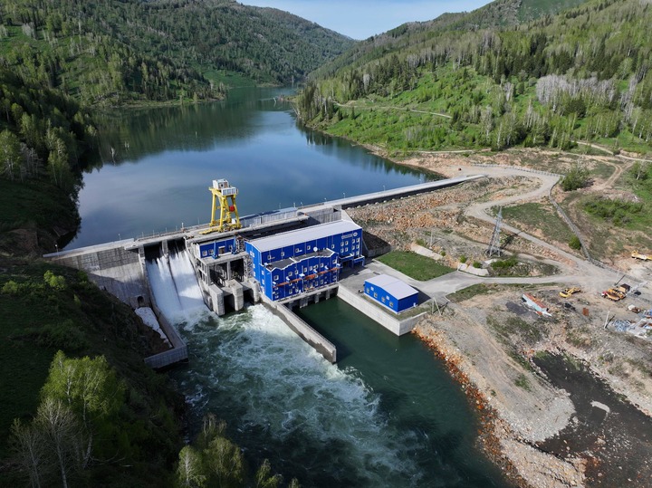カザフスタン東カザフスタン州にあるトゥルグスン水力発電所。(5月8日、ドローンから、アスタナ=新華社記者/李任滋)