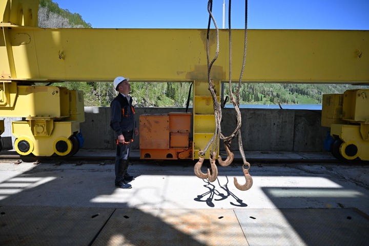 カザフスタン東カザフスタン州にあるトゥルグスン水力発電所で、設備を点検する水力発電所の現場管理員。(5月8日撮影、アスタナ=新華社記者/李任滋)