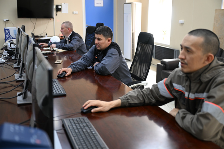 カザフスタン東カザフスタン州にあるトゥルグスン水力発電所の中央制御室で働く従業員。(5月8日撮影、アスタナ=新華社記者/李任滋)