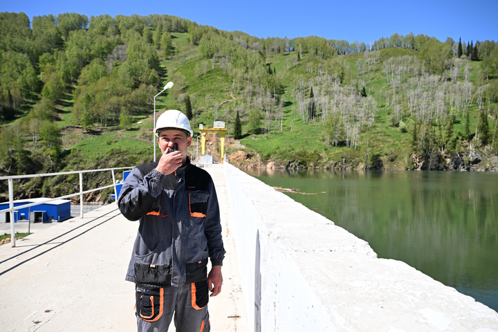 カザフスタン東カザフスタン州にあるトゥルグスン水力発電所で、トランシーバーを使って同僚と連絡を取り合う現場管理員。(5月8日撮影、アスタナ=新華社記者/李任滋)
