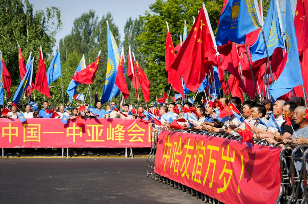 18日、空港に向かう沿道で、中国とカザフスタンの国旗を振り、習近平主席のサミット出席成功を熱烈に祝う中国系企業と留学生の代表ら。(アスタナ=新華社記者/畢暁洋)